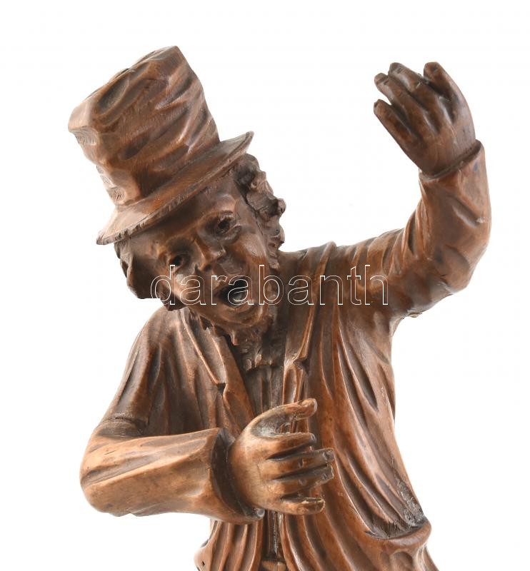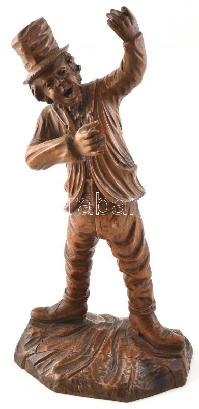 Leírás: Jelzés nélkül: Mulatozó, faragott fa szobor, repedésekkel, több helyen javított, m: 38 cm