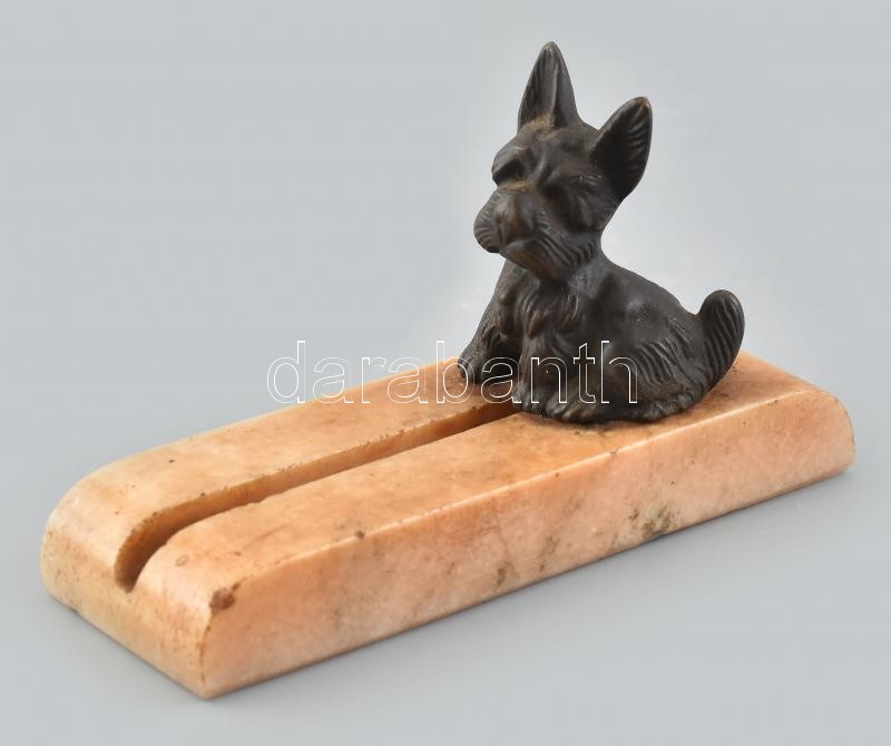 Kutyás névjegytartó, bronz, márvány talpon, kopásnyomokkal, m: 8 cm https://www.darabanth.com/hu/420-Gyorsarveres/420.0/Mutargy-papirregiseg-egyeb/Szobrok-kisplasztikak-plakettek~500009/Kutyas-nevjegytarto-bronz-marvany-talpon-kopasnyomokkal-m-8-cm~II2661194