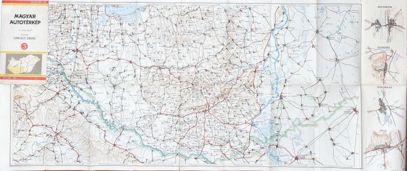 Magyar autótérkép, 1:300 000, tervezte: Gergely Endre, 110×42 cm https://www.darabanth.com/hu/420-Gyorsarveres/420.0/Mutargy-papirregiseg-egyeb/Terkepek~500029/Magyar-autoterkep-1300-000-tervezte-Gergely-Endre-110C39742-cm~II2666376