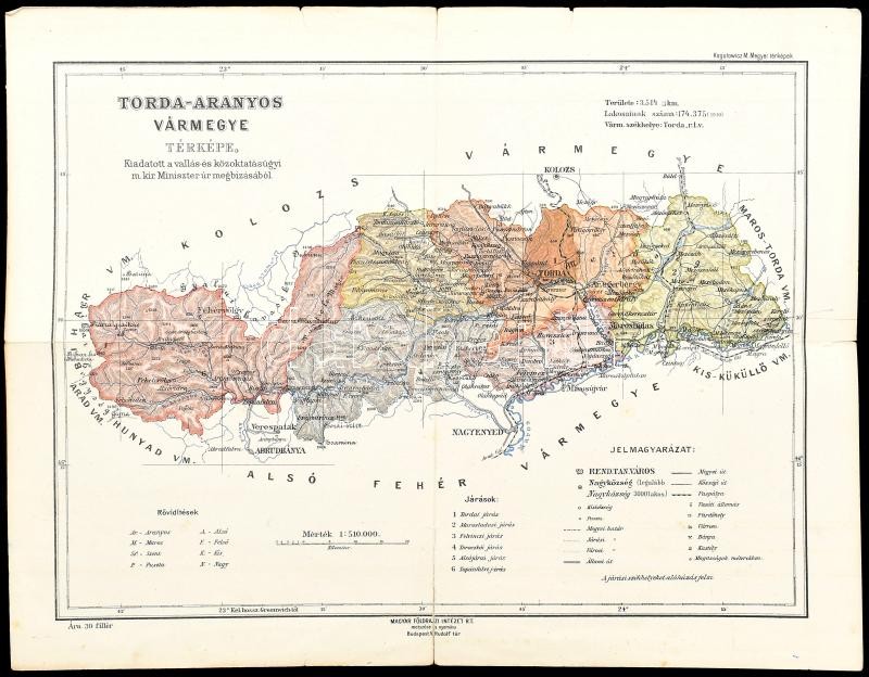 Leírás: Torda-Aranyos vármegye térképe, 1:510 000, Magyar Földrajzi Intézet Rt., szakadásokkal, 25×32 cm