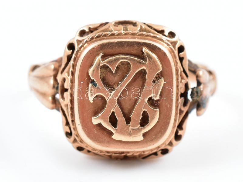 Arany (14k/Au) monogramos pecsétgyűrű, jelzett, nettó: 5,67g, m: 62. https://www.darabanth.com/hu/420-Gyorsarveres/420.0/Nemesfem-disztargyak-ekszerek-dragakovek/Nemesfem-disztargyak-ekszerek-dragakovek~2000023/Arany-14kAu-monogramos-pecsetgyuru-jelzett-netto-5-67g-m-62~II2636263