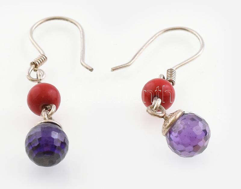 Leírás: Ezüst(Ag) fülbevalópár ametiszt és korall díszítéssel, jelzés nélkül, h: 3 cm, bruttó: 5,1 g