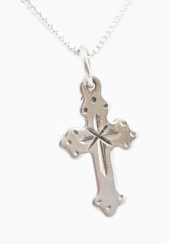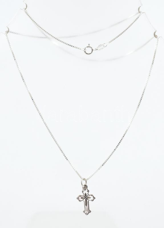 Leírás: Ezüst(Ag) venezianer nyaklánc kereszt medállal, jelzett, h: 51 cm, 2,3×1,2 cm, nettó: 3,5 g