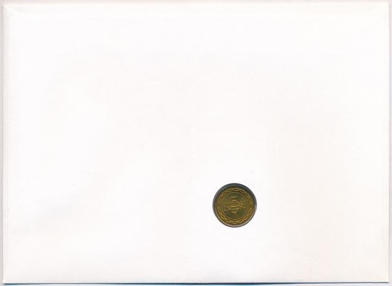 Bahrein 1992. 5f sárgaréz felbélyegzett borítékban, bélyegzéssel, német nyelvű tájékoztatóval T:1- patina, kis karc Bahrain 1992. 5 Fils brass in envelope with stamp, cancellation and a prospectus in german C:AU patina, small scratches
