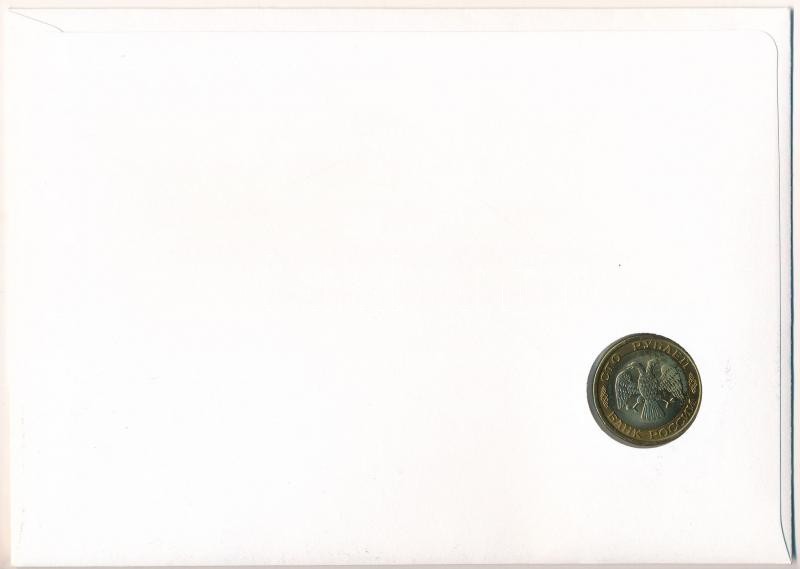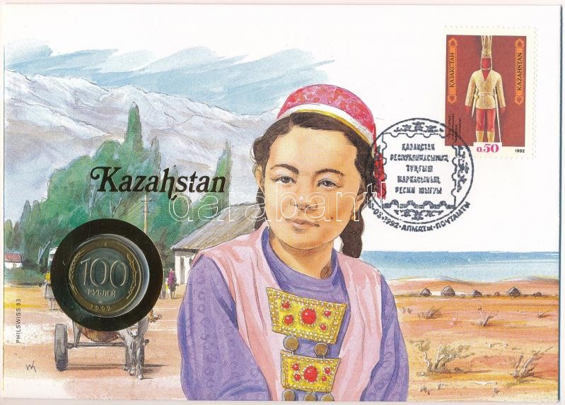 Kazahsztán felbélyegzett borítékban, bélyegzéssel, német nyelvű tájékoztatóval, benne Oroszország 1992. 100R bimetál T:1- patina Kazakhstan in envelope with stamp, cancellation and a prospectus in german, in it Russia 1992. 100 Rubles bimetallic C:AU patina
