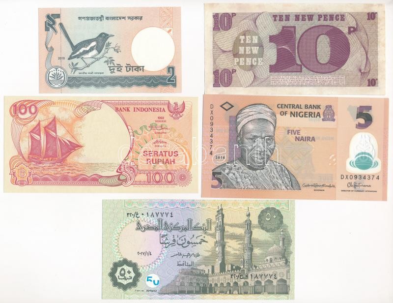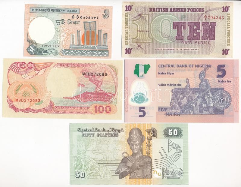 5db klf külföldi bankjegy klf országokból (Nigéria, Egyiptom, Indonézia, Nagy-Britannia), közte Nagy-Britannia / Katonai kiadás 1972. 10P "6. sorozat + Banglades 2010. 2T T:I,I- 5pcs of diff banknotes from diff countries (Nigeria, Egypt, Indonesia, Great-Britain, Bangladesh), with United Kingdom / British Armed Forces 1972. 10 Pence "6th series" + Bangladesh 2010. 2 Taka C:UNC,AU