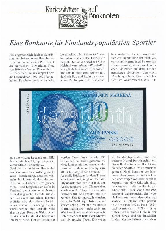 Finnország 1986. 10M, német nyelvű "Kuriositäten auf Banknoten" tájékoztatólappal T:I