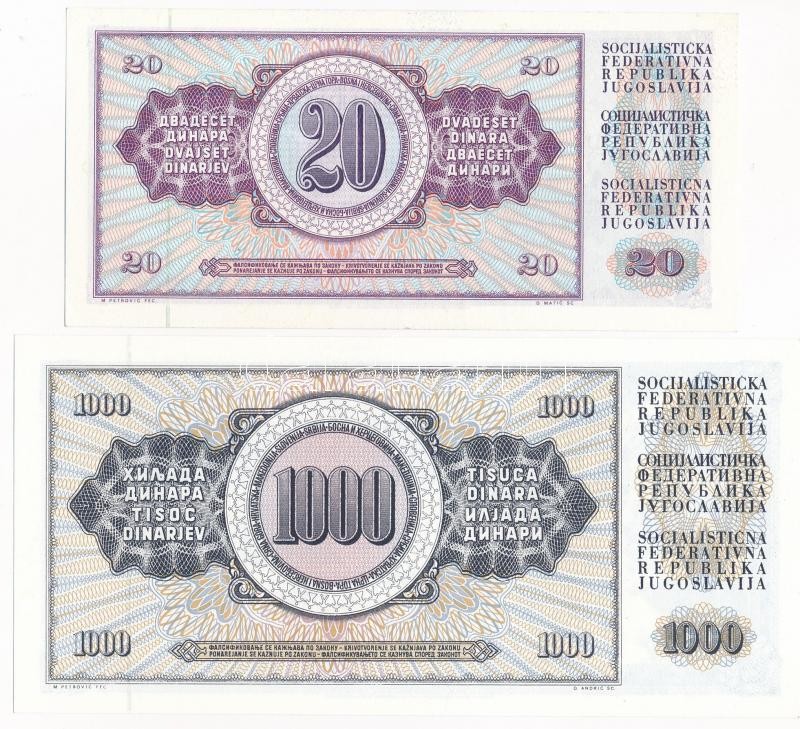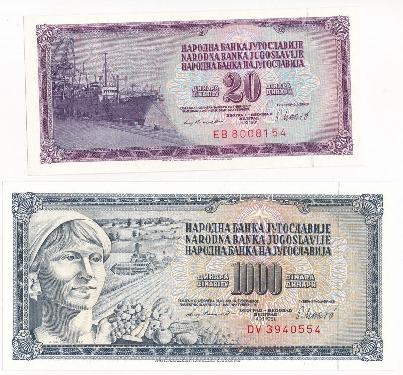 Yugoslavia 1981. 20 Dinara + 1000 D... https://www.darabanth.com/hu/420-Gyorsarveres/420.0/Numizmatika/Kulfoldi-bankjegyek~2000015/Jugoszlavia-1981-20D-plus-1000D-TI-Yugoslavia-1981-20-Dinara-plus-1000-Dinara-CUNC~II2654629