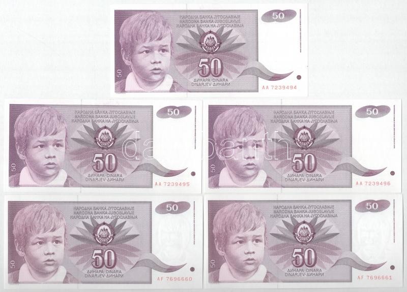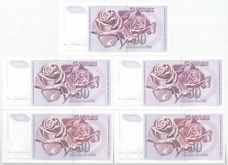 Yugoslavia 1990. 50 Dinara (5x) 2+3 consecutive serials "AF 7696660 - AF 7696661" and "AA 7239494 - AA 7239496" C:UNC