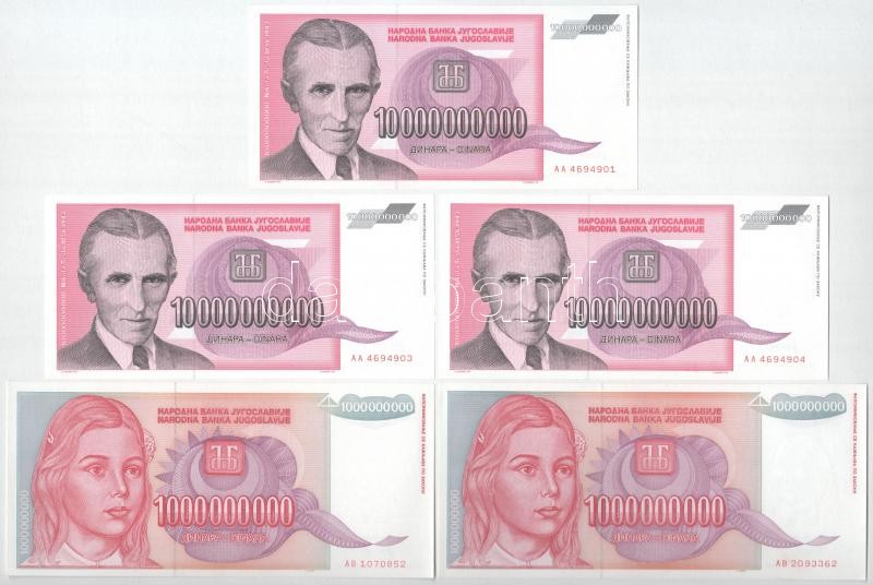 Yugoslavia 1993. 1.000.000.000 Dinara (2x) + 10.000.000.000 Dinara (3x) with consecutive pair "AA 4694903 - AA 4694904" and consecutive with one leap "AA 4694901" C:UNC,AU