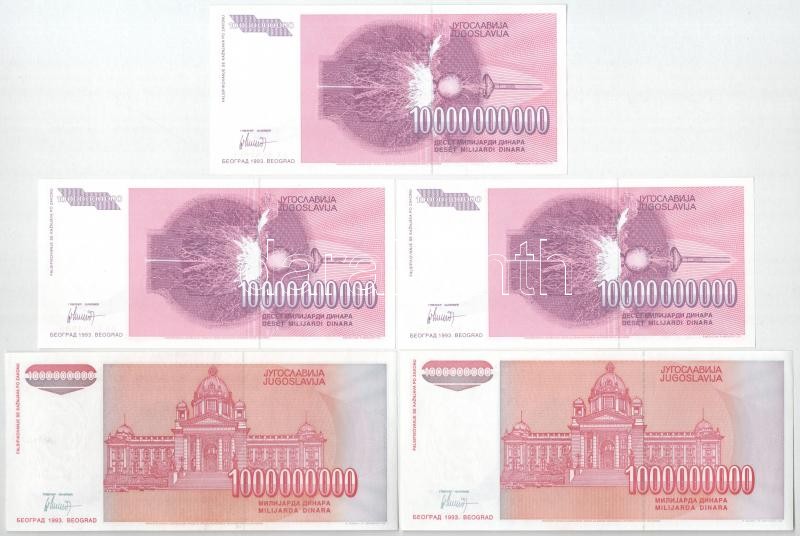 Leírás: Jugoszlávia 1993. 1.000.000.000D (2x) + 10.000.000.000D (3x) közte sorszámkövető pár "AA 4694903 - AA 4694904" és egyugrásos sorszámkövető "AA 4694901" T:I,I-