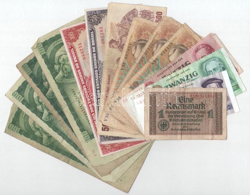 14pcs of mixed foreign banknote lot, in it Brazil ND (1966) 50 Cruzeiros with "5 Centavos" overprint + 100 Cruzeiros with "10 Centavos" overprint + Czechoslovakia 1961-1986. 10 Korun - 500 Korun (8x) + Germany ND (1939-1944) 1 Mark + GDR 1971-1975. 5 Mark - 50 Mark (3xdiff) C:F,VG