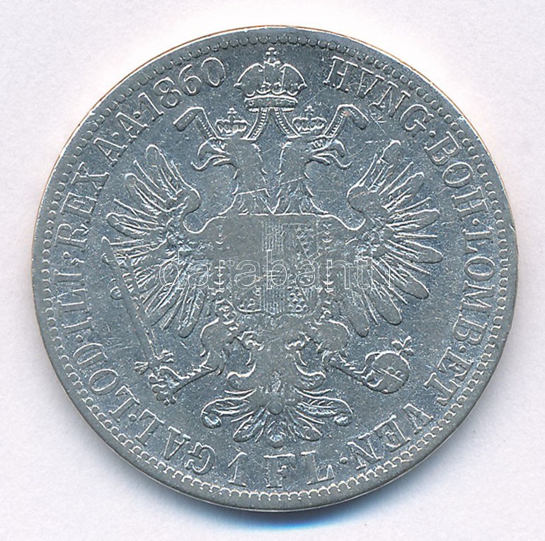 Krause K... https://www.darabanth.com/hu/420-Gyorsarveres/420.0/Numizmatika/Kulfoldi-fem-es-ezustpenzek~2000016/Ausztria-1860A-1Fl-Ag-T2--Austria-1860A-1-Florin-Ag-CVF--Krause-KM232219~II2661826