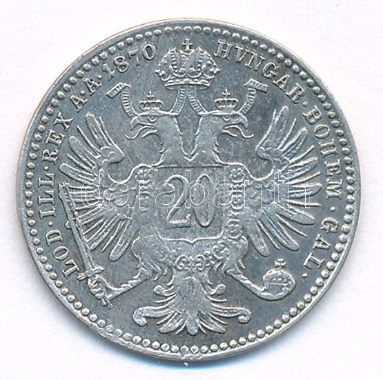 Austria 1870. 20... https://www.darabanth.com/hu/420-Gyorsarveres/420.0/Numizmatika/Kulfoldi-fem-es-ezustpenzek~2000016/Ausztria-1870-20kr-Ag-Ferenc-Jozsef-T2-Austria-1870-20-Kreuzer-Ag-Franz-Joseph-CVF~II2655288