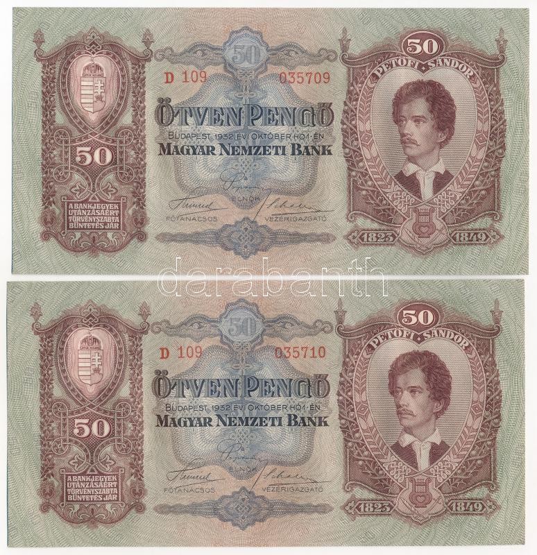 1932. 50P (2x) sorszámkövetők "D 109 035709 - D 109 035710" ... https://www.darabanth.com/hu/420-Gyorsarveres/420.0/Numizmatika/Magyar-bankjegyek~2000007/1932-50P-2x-sorszamkovetok-D-109-035709-D-109-035710-TI-I-Adamo-P14~II2660910