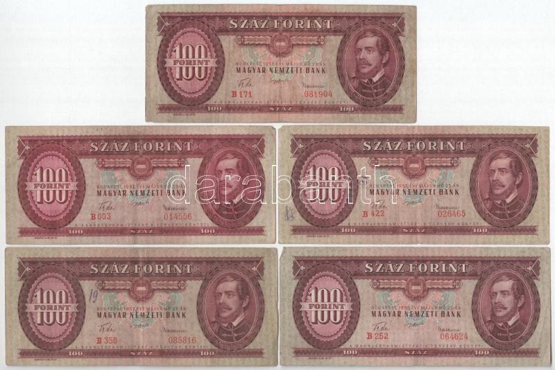 1957. 100Ft (5x) T:III,III- Adamo F29 https://www.darabanth.com/hu/420-Gyorsarveres/420.0/Numizmatika/Magyar-bankjegyek~2000007/1957-100Ft-5x-TIII-III-Adamo-F29~II2658640