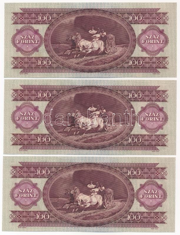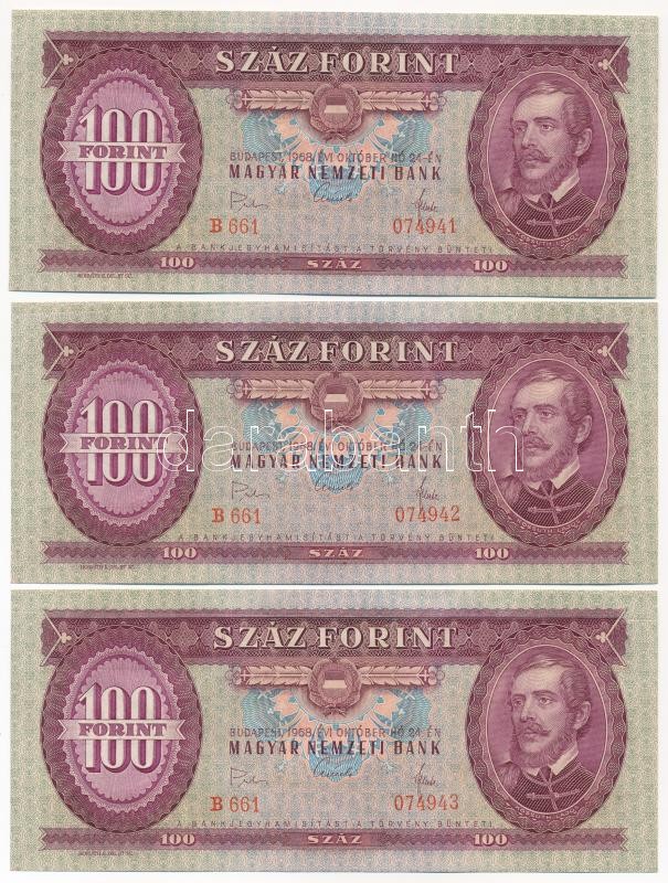 Leírás: 1968. 100Ft (3x) "B 661 074941 - B 661 074943" sorszámkövetők T:I,I- nyomdai papírránccal, hullámos papír