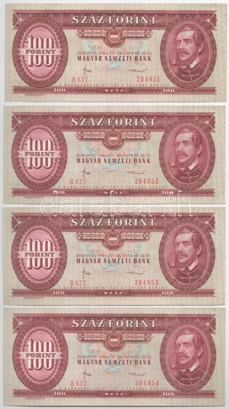 Leírás: 1984. 100Ft (4x) "B 627 204951 - B 627 204954" sorszámkövetők T:II nyomdai papírránccal, egyiken kis folt