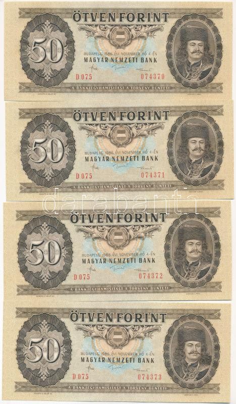 Leírás: 1986. 50Ft (4x) "D 075 074370 - D 075 074373" sorszámkövetők T:I-II nyomdai papírránccal, hullámos papír