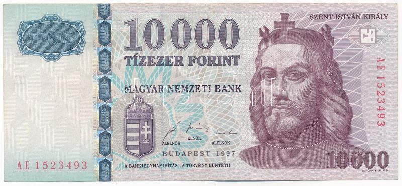 1997. 10.000Ft "AE 1523493" T:III Adamo F58.4 https://www.darabanth.com/hu/420-Gyorsarveres/420.0/Numizmatika/Magyar-bankjegyek~2000007/1997-10000Ft-AE-1523493-TIII-Adamo-F584~II2662724
