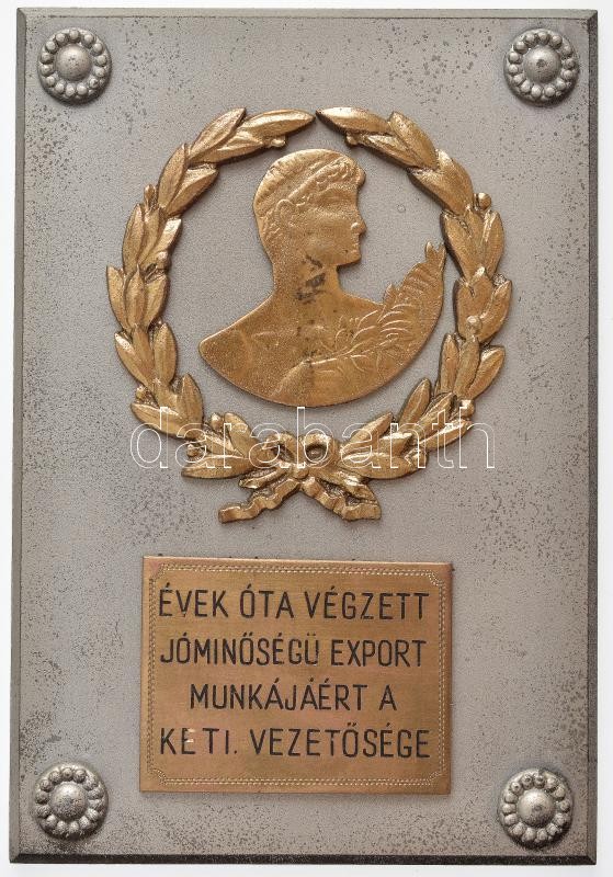 Leírás: ~1960-1970. "Évek óta végzett jóminőségű export munkájáért a KETI (Kisipari Exportra Termeltető Iroda) vezetősége" egyoldalas fém emlékplakett aranyozott Br és Br rátétekkel (118x80mm) T:2 patina