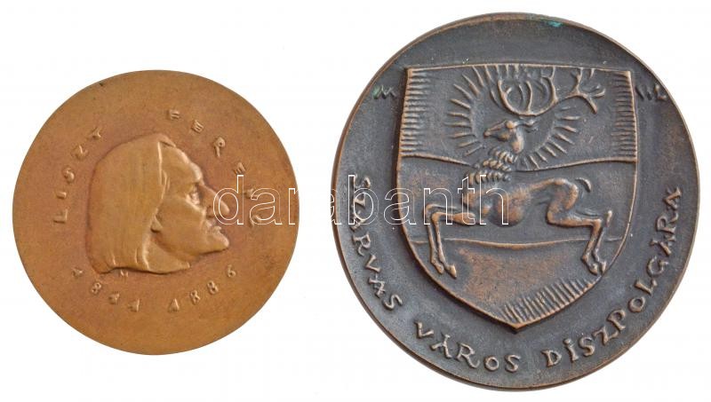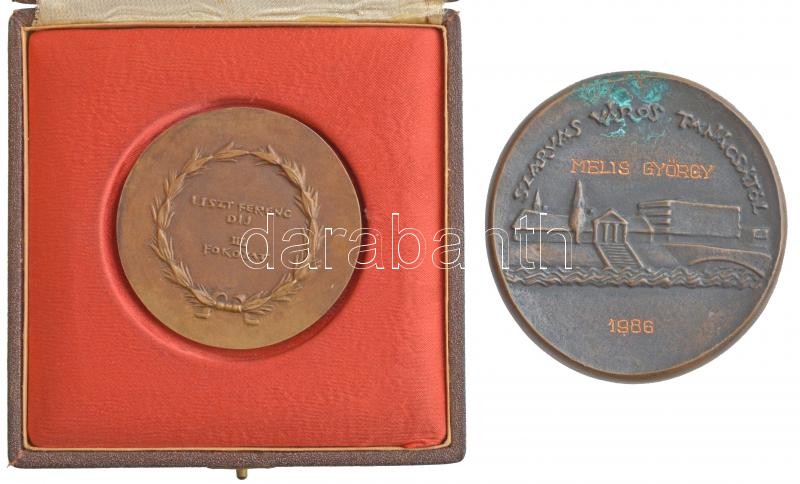 Leírás: Madarassy Walter (1909-1994) 1986. "Szarvas Városért / Szarvas Város Tanácsától" öntött Br emlékérem "Melis György 1986" gravírozással (88mm) + ~1990. "Liszt Ferenc-díj II. fokozat" Br emlékérem tokban Melis György hagyatékából (68mm) T:1-