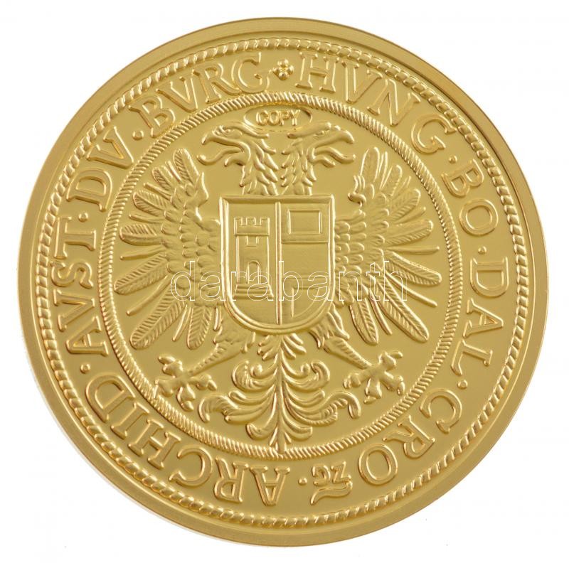 Leírás: DN "Történelmi aranypénzek - II. Mátyás 10 Dukát 1608-1618" aranyozott Cu-Ni utánveret "COPY" beütéssel, kapszulában (26,30g/38mm) T:PP