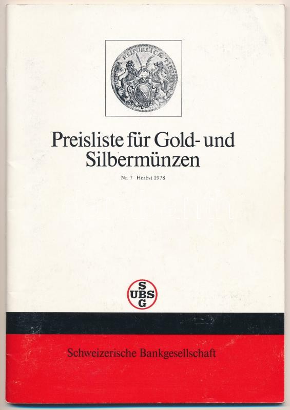 Preisliste für Gold- und Silbermünzen. Nr. 7 Herbst 1978. Schweizerische Bankgesellschaft. Árverési katalógus használt állapotban / auction catalogue in used condition.