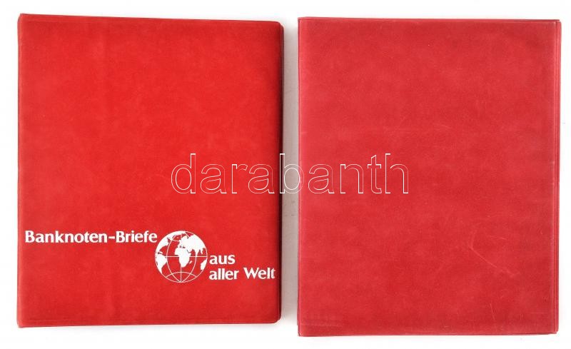 Leírás: "Banknoten Briefe aus aller Welt" piros, plüssborítású, négygyűrűs album 30db, osztás nélküli, berakólappal, plüssborítású tokban