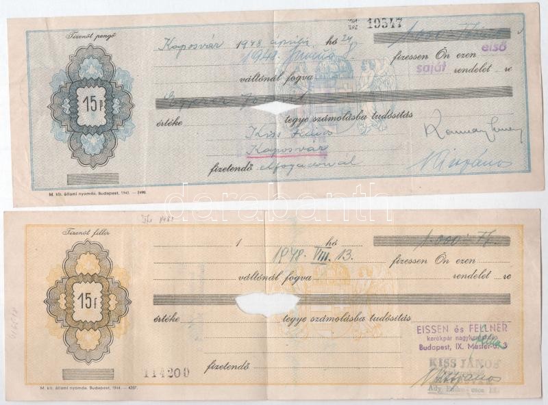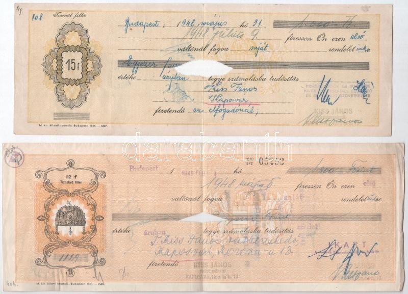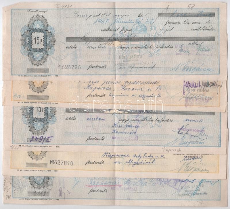 Leírás: 1947-1948 9 db-os érvénytelenített váltó-tétel, hátoldalán illetékbélyegekkel, bélyegzésekkel T:III