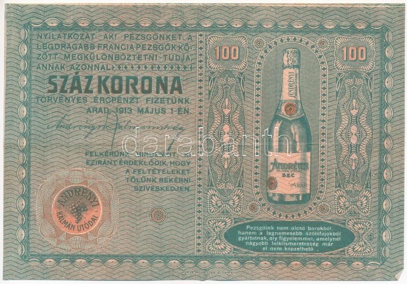Leírás: Arad 1913. május 1. " Andrényi Kálmán Utódai" pezsgőreklám nyereményjáték felhívással 100K-ról T:III