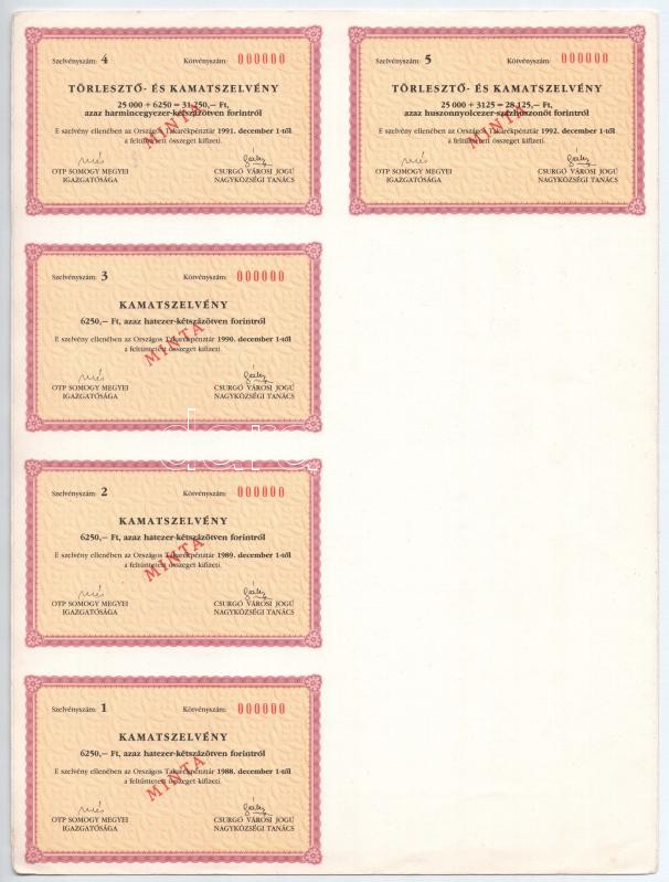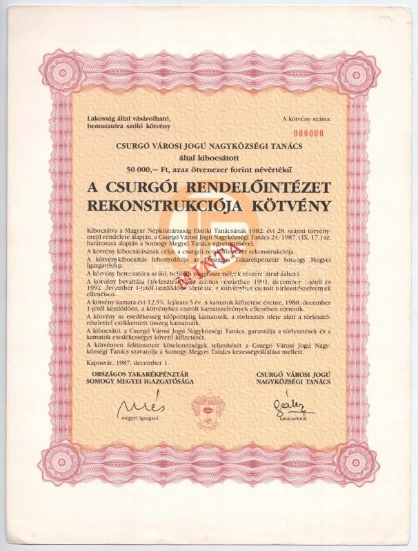 Leírás: Kaposvár 1987. "A Csurgói Rendelőintézet Rekonstrukciója Kötvény" "MINTA" kötvény 5.000Ft-ról + 10.000Ft-ról + 50.000Ft-ról, "000000" sorszámmal, szelvényekkel T:I-