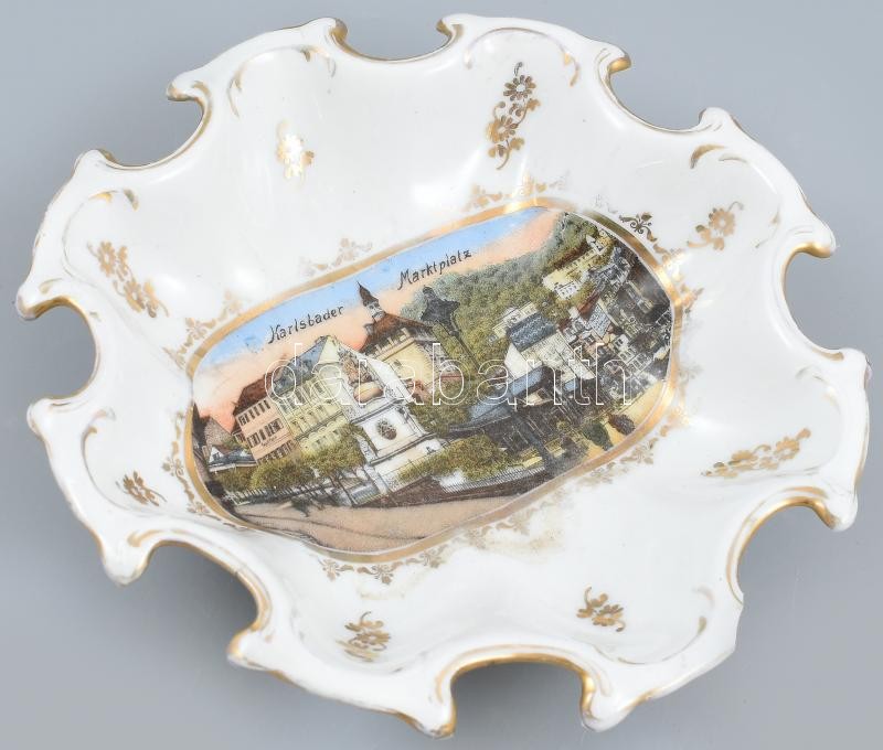 Leírás: Karlsbadi porcelán kínáló, matricás, sérült, kopott, jelzés nélkül, d: 20 cm