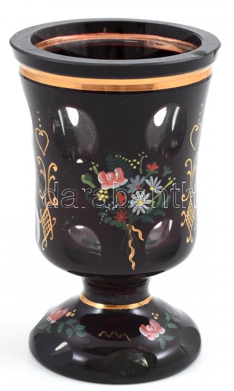 Leírás: Kétrétegű, hámozott üvegpohár, kézzel festett, csorbával, m: 15,5 cm