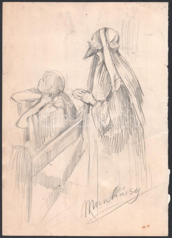 Leírás: Munkácsy jelzéssel: Két alak. Ceruza, papír, kissé foltos, lapszéli kisebb szakadással, 30,5x22 cm.