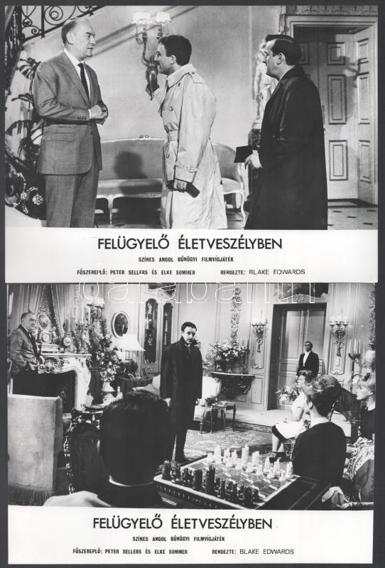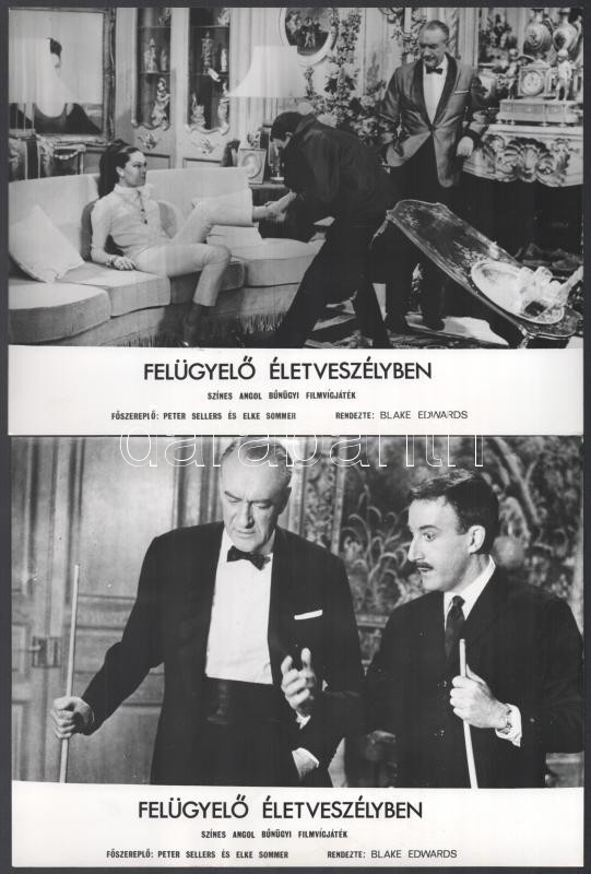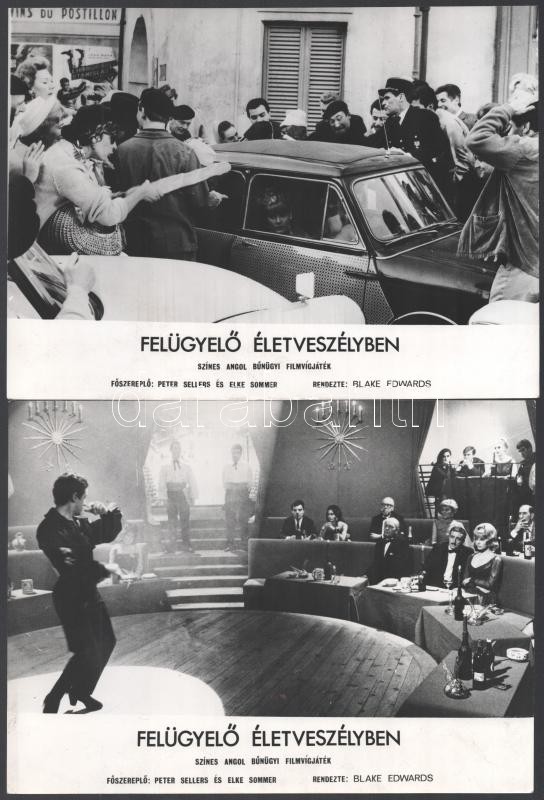 1964 ,,Felügyelő életveszélyben" című angol film jelenetei és szereplői (köztük Peter Sellers, Elke Sommer), 13 db vintage produkciós filmfotó, ezüst zselatinos fotópapíron, a használatból eredő kisebb hibákkal, 18x24 cm