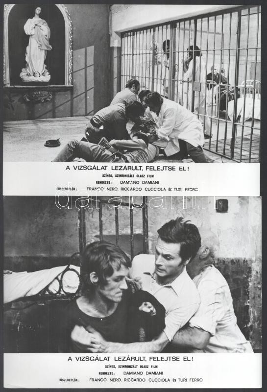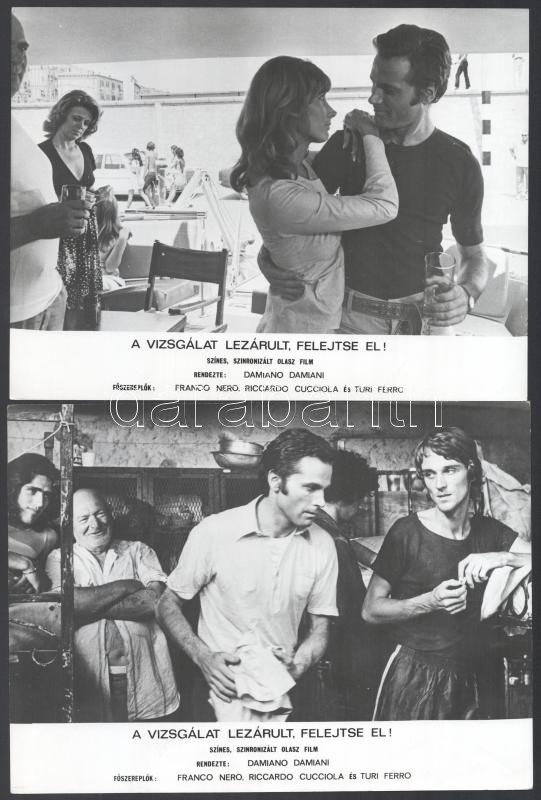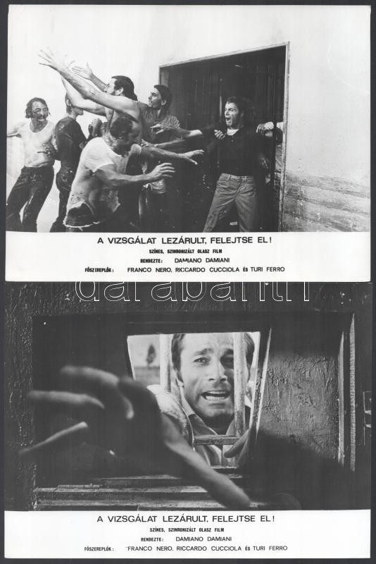 1971 ,,A vizsgálat lezárult, felejtse el!" című olasz film jelenetei és szereplői (köztük Franco Nero, Riccardo Cucciola, Turi Ferro), 13 db vintage produkciós filmfotó, ezüst zselatinos fotópapíron, a használatból eredő kisebb hibákkal, 18x24 cm