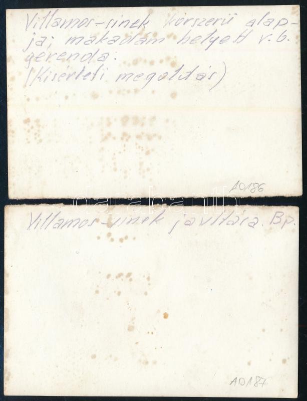 Leírás: cca 1940-1950 Bp., villamos sínek javítása, korszerűsítése, 2 db fotó, hátoldalukon feliratozva, 9x6 cm