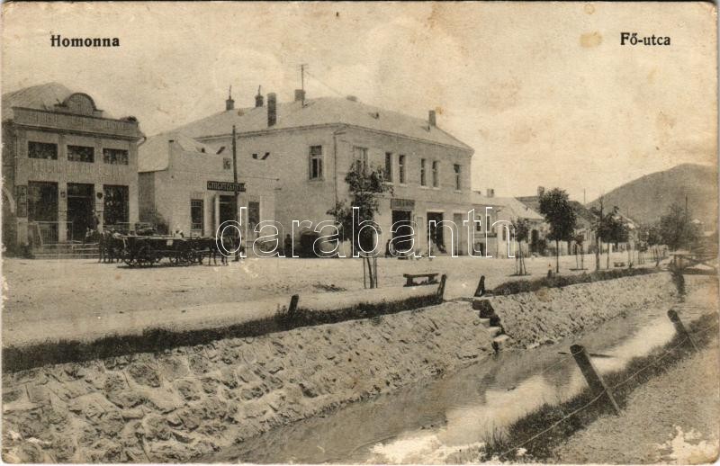1914 Homonna, Homenau, Humenné; Fő utca, gyógyszertár, Cement gyári raktár, Klein Dávid és fia üzlete. Hossza Gyula kiadása / main street, pharmacy, shop (EK)