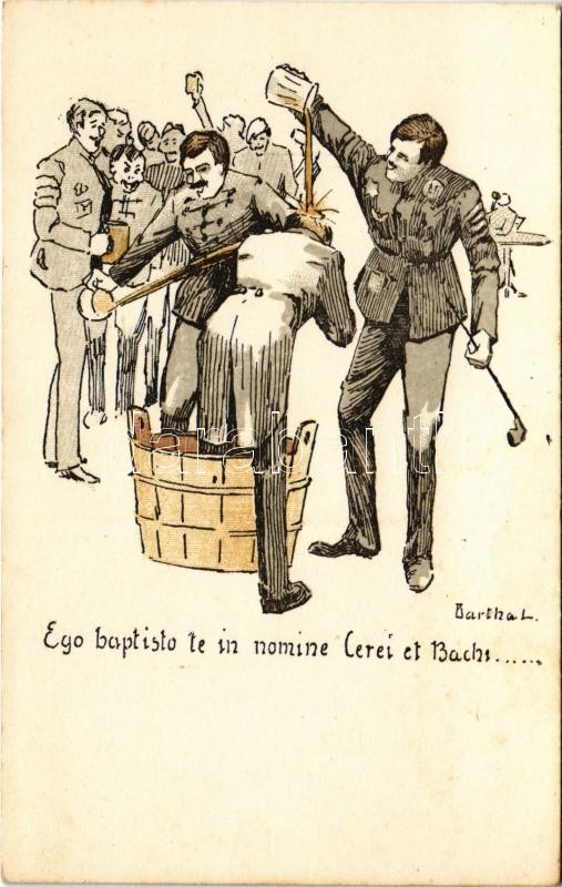 Selmecbánya, Schemnitz, Banská Stiavnica; Ego baptisto te in nomine Cerei et Bachi... A Selmeci Diákéletből III. Studentika. Röttig-Romwalter nyomda rt. Sopron / Studentica art postcard s: Bartha L.