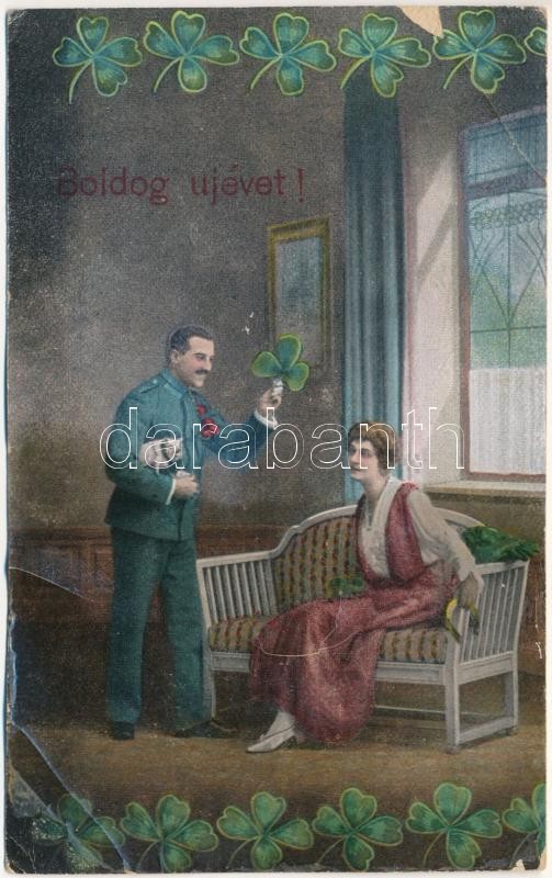 Leírás: 1918 Boldog Újévet! / WWI Austro-Hungarian K.u.K. military art postcard with New Year greeting, romantic couple and clovers. O.K.W. 470. (EB)