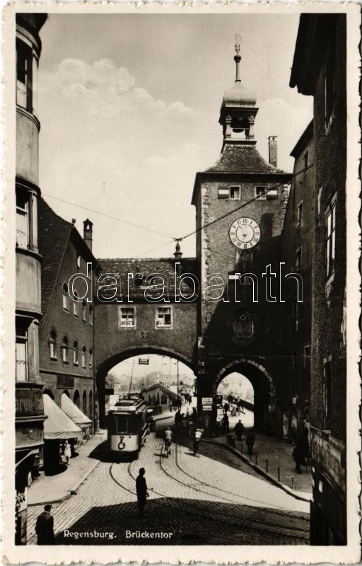 1931 Regensburg, Brückentor / street view, bridge gate, tram (EK) https://www.darabanth.com/hu/421-Gyorsarveres/421.0/Kepeslapok/Nemetorszag~1500093/1931-Regensburg-Bruckentor-street-view-bridge-gate-tram-EK~II2673978