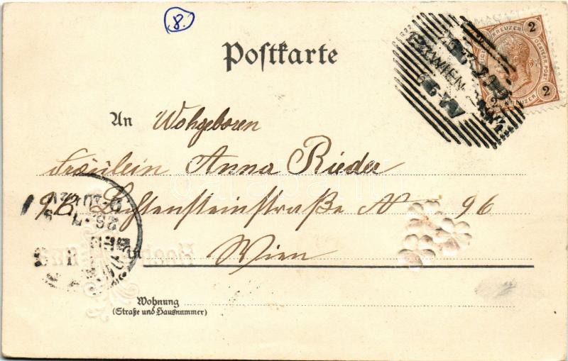 Leírás: 1899 (Vorläufer) Hoch Anna / Name Day greeting art postcard with silk flowers. litho (EK)