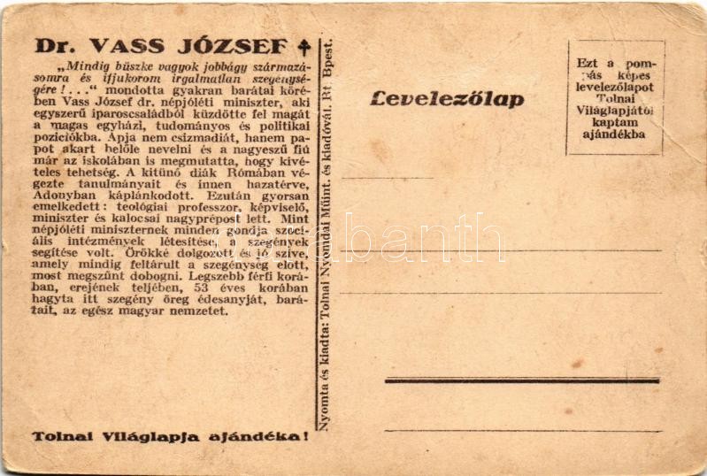 Dr. Vass József római katolikus pap, kalocsai nagyprépost, kereszténypárti politikus, a Bethlen-kormány népjóléti és munkaügyi minisztere - gyászlap. Tolnai Világlapja ajándéka (EK)
