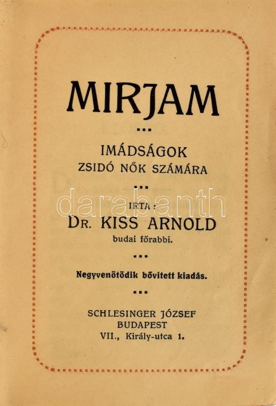 Dr. Kiss Arnold: Mirjam. Imádságok zsidó nők számára. Bp., é.n., Schlesinger József, 615+VII p. Aranyozott egészbőr-kötésben, festett lapélekkel, néhány lapon kisebb szakadással, foltokkal.