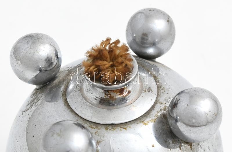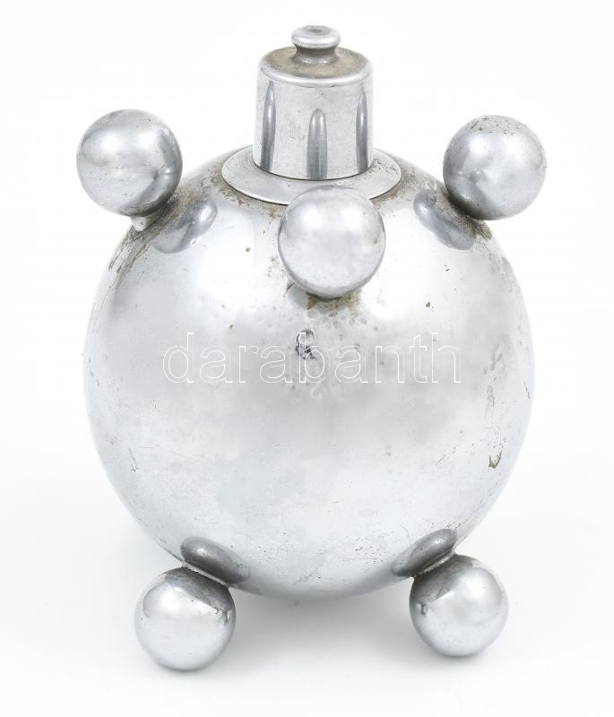 Leírás: Art deco többszemélyes, gömb alakú asztali öngyújtó. Krómozott fém, XX. sz. első fele. Korának megfelelő állapotban, m: 10,5 cm