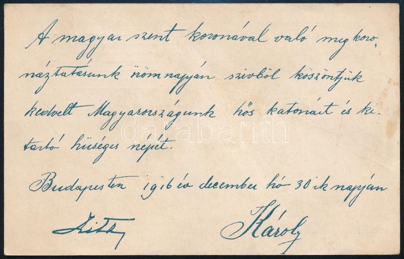 Leírás: 1916 Bp., IV. Károly és Zita királyné által írt nyomtatott képeslap hős katonáknak