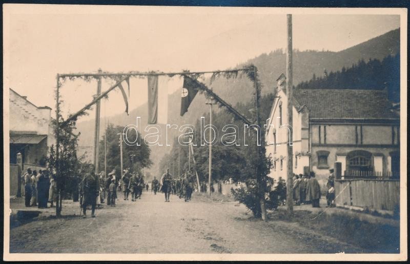 1938 Bevonulás (Felvidék), díszkapu zászlókkal, 8,5×13 cm https://www.darabanth.com/hu/421-Gyorsarveres/421.0/Mutargy-papirregiseg-egyeb/Militaria~500028/1938-Bevonulas-Felvidek-diszkapu-zaszlokkal-8-5C39713-cm~II2670612