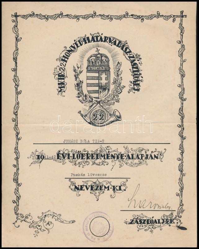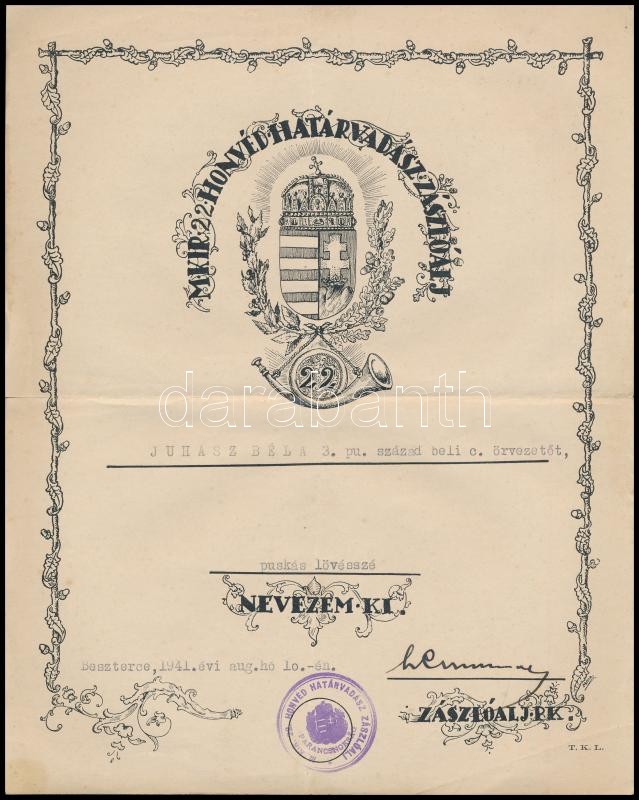 1941-1942 M. kir. 22. honvéd határvadász zászlóalj puskás lövésszé kin... https://www.darabanth.com/hu/421-Gyorsarveres/421.0/Mutargy-papirregiseg-egyeb/Militaria~500028/1941-1942-M-kir-22-honved-hatarvadasz-zaszloalj-puskas-lovessze-kinevezo-oklevele-2-db~II2669779