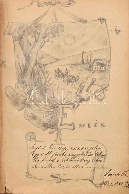 Leírás: Cca. 1888 Emlékalbum. Dolfel Hermin névvel, rajzokkal, versekkel, viseletes állapotban, 21x15cm